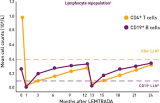 The drug company website for Lemtrada/Alemtuzumab has a very whizzy graph to show what the suggested rate of lymphocyte repopulation is. However this is where things get complicated as in the UK we only show the general Lymphocyte count, in the US they split it into the specific types of B and T cells (CD4+, CD8+/CD19+) on their blood test results so it's far easier to track your recovery:
